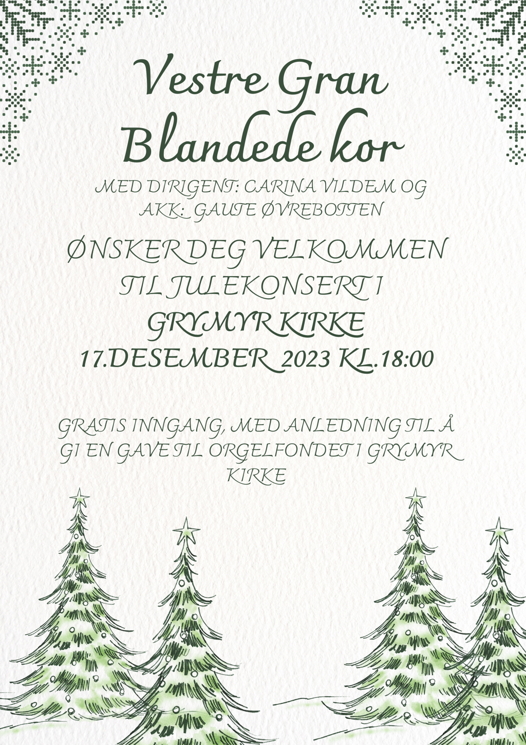 Julekonsert søndag 17. desember 2023 Publisert av Anne Mette Nordengen den 02.12.23. Oppdatert 04.12.23.